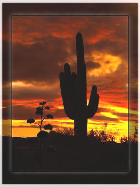 Window of Light© is a fiery Sonoran Desert sunset. The sky is cloudy, but it is lit brilliantly in this early evening. The giant saguaro and flowering agave stand bravely against the gathering night.