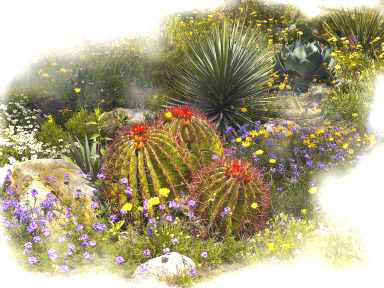 Cactus Garden©. Somewhere north of Tucson and East of Phoenix a little garden of fire barrel cactus and yucca is growing. This little garden is sprinkled with wild flowers accenting the rugged beauty of the cactus in every season. Let your eyes take a walk through this exciting garden.